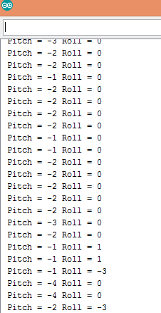 The Arduino reads these acceleration values from the sensor and then calculate the pitch and roll values using the functions provided by the MPU6050 library. These pitch and roll values are shown on the serial monitor output screenshot given below. Whenever we move the sensor, the pitch and roll values on the serial monitor will change according to the movement.